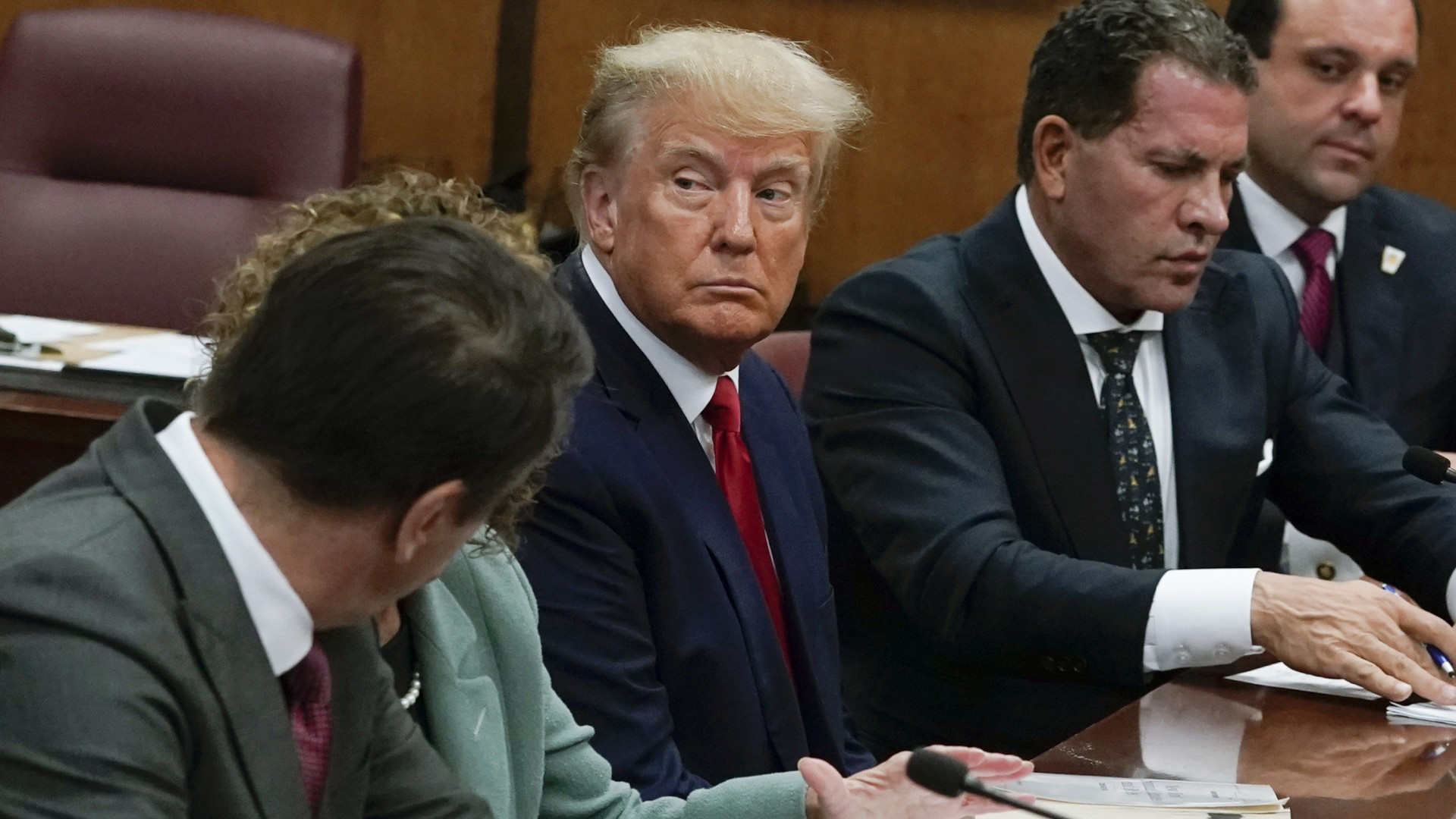 Serio e con un'aria di sfida. Così appare Donald Trump nella prima foto che lo ritrae seduto al banco degli imputati in tribunale. Al suo fianco gli avvocati Joe Tacopina e Susan Necheles.
