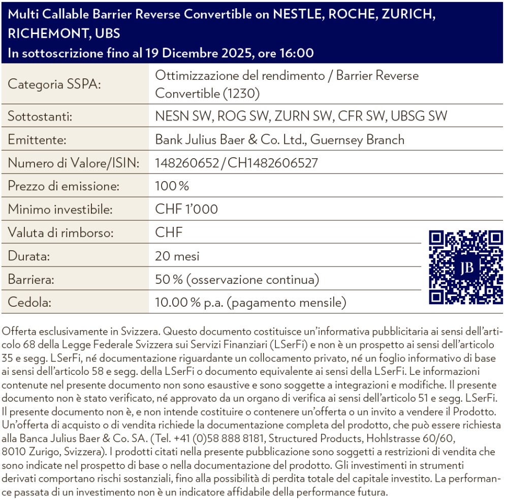 Callable Barrier Reverse Convertible su 5 azioni di qualità svizzere (Nestle, Roche, Zurich, Richemont, UBS) offre una cedola garantita annua del 10.00 % indipendentemente dalla performance dello strumento sottostante, con protezione fino ad un ribasso del 50 %.
