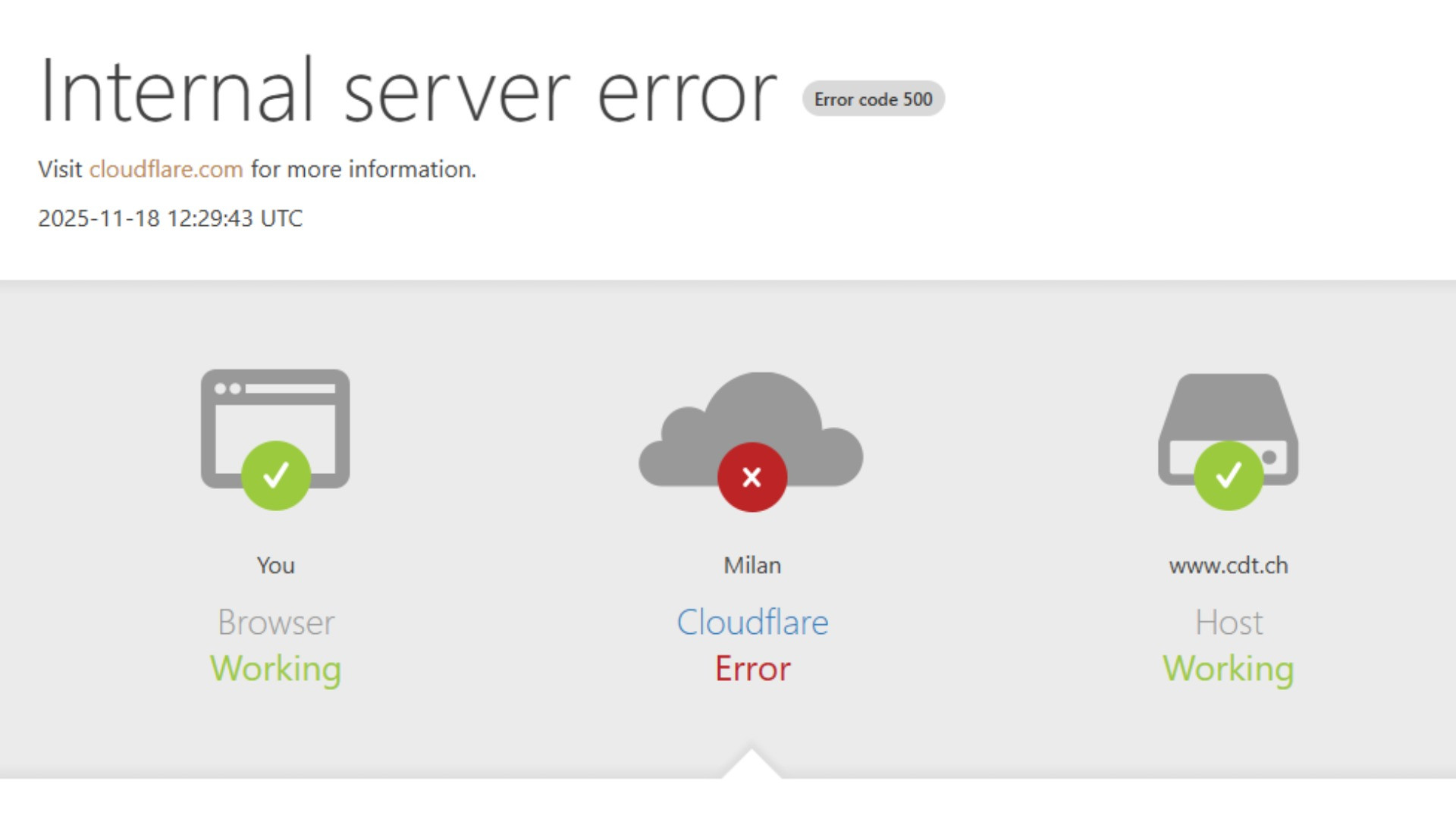 Parte di Internet, attorno a mezzogiorno, ha smesso di funzionare o ha funzionato a singhiozzo. Il motivo? Un problema tecnico di Cloudflare. Sono stati colpiti, fra gli altri, piattaforme social come X e vari portali di informazione, fra cui i nostri Corriere del Ticino e TicinoNews. Anche il sito web DownDetector, che monitora le interruzioni, è stato colpito dai problemi tecnici legati a Cloudflare. Quando si è caricato, per contro, il portale specializzato ha mostrato un notevole aumento delle segnalazioni di disservizio. A non funzionare, sul mezzogiorno, pure ChatGPT.
