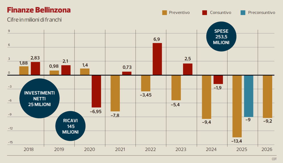 Ventiquattro mesi fa: «È ora di contenere davvero la spesa». Quest’anno: «Si evidenzia la necessità di potenziare settori specifici, caratterizzati da una forte valenza trasversale all’interno dell’organizzazione. In particolare, si possono individuare due direttrici di intervento prioritarie: l’adozione di strategie efficaci nell’ambito del promovimento e dello sviluppo economico e il rafforzamento delle attività del settore controllo interno e qualità». È vero che il disavanzo previsto per il 2026 (9,2 milioni di franchi circa) è migliore rispetto a quello preconizzato per il 2025 (13,4 milioni), tuttavia non è che sia cambiato granché a Bellinzona. Tranne le conclusioni alle quali arriva la Commissione della Gestione; il rapporto, di cui è relatore Michele Egloff (Unità di sinistra), che preavvisa favorevolmente il Preventivo all’indirizzo del Legislativo (che lo discuterà lunedì 15 dicembre) è firmato da tutti i partiti tranne che dal gruppo Verdi-FA-Indipendenti. E il moltiplicatore? Per ora non si tocca (vedi più avanti). Rimarrà fisso al 93% sia per le persone fisiche sia per quelle giuridiche.
