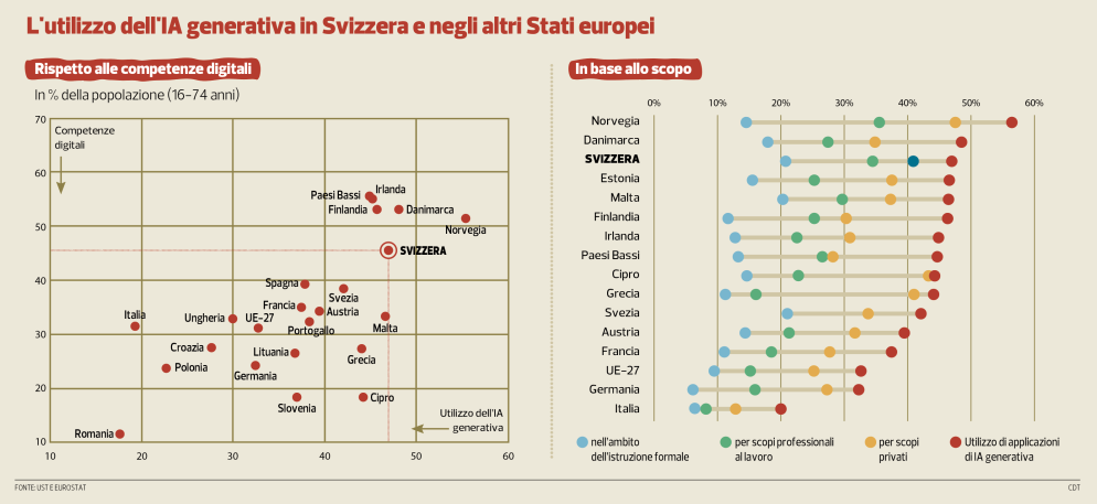 Una velocità di diffusione inedita. L’intelligenza artificiale generativa è un caso unico: tre anni dopo essere stata messa a disposizione in Rete, quasi la metà della popolazione svizzera già dichiara di utilizzarla (il 47%, per la precisione). Perlomeno è quanto emerso dall’inchiesta realizzata per il 2025 dall’Ufficio federale di statistica e pubblicata ieri, con tanto di paragoni con altri Paesi europei. E proprio qui, nel confronto, si trovano i dati forse più interessanti. Infatti, l’UST sottolinea: «Ciò che sorprende maggiormente è che alcuni Paesi meno digitalizzati, come Grecia, Malta o Cipro, figurano tra i maggiori utilizzatori di IA generativa, a testimonianza del profondo cambiamento del panorama digitale provocato dall’arrivo di questa nuova tecnologia». Insomma, se la Svizzera non fa notizia, più inattesi sono i dati registrati altrove, in regioni meno digitalizzate. Lo ricordiamo: l’IA generativa è quel tipo di IA che crea nuovi contenuti originali (testi, immagini, video), partendo da semplici richieste testuali e apprendendo da dati esistenti.