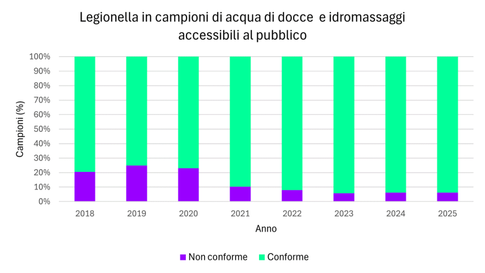 I controlli periodici del Laboratorio cantonale evidenziano un miglioramento della situazione nelle docce e nelle vasche idromassaggio accessibili al pubblico, anche se la presenza di legionella continua a richiedere attenzione e monitoraggio costante.