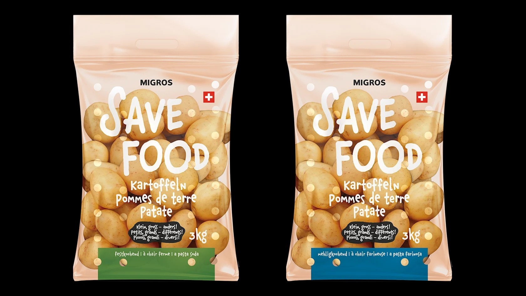Si comincia con le patate, particolarmente adatte al nuovo approccio grazie al raccolto eccezionalmente buono dell'anno scorso. Nei prossimi mesi l'offerta si estenderà ad altri articoli quali carote, cipolle, mele e pere.