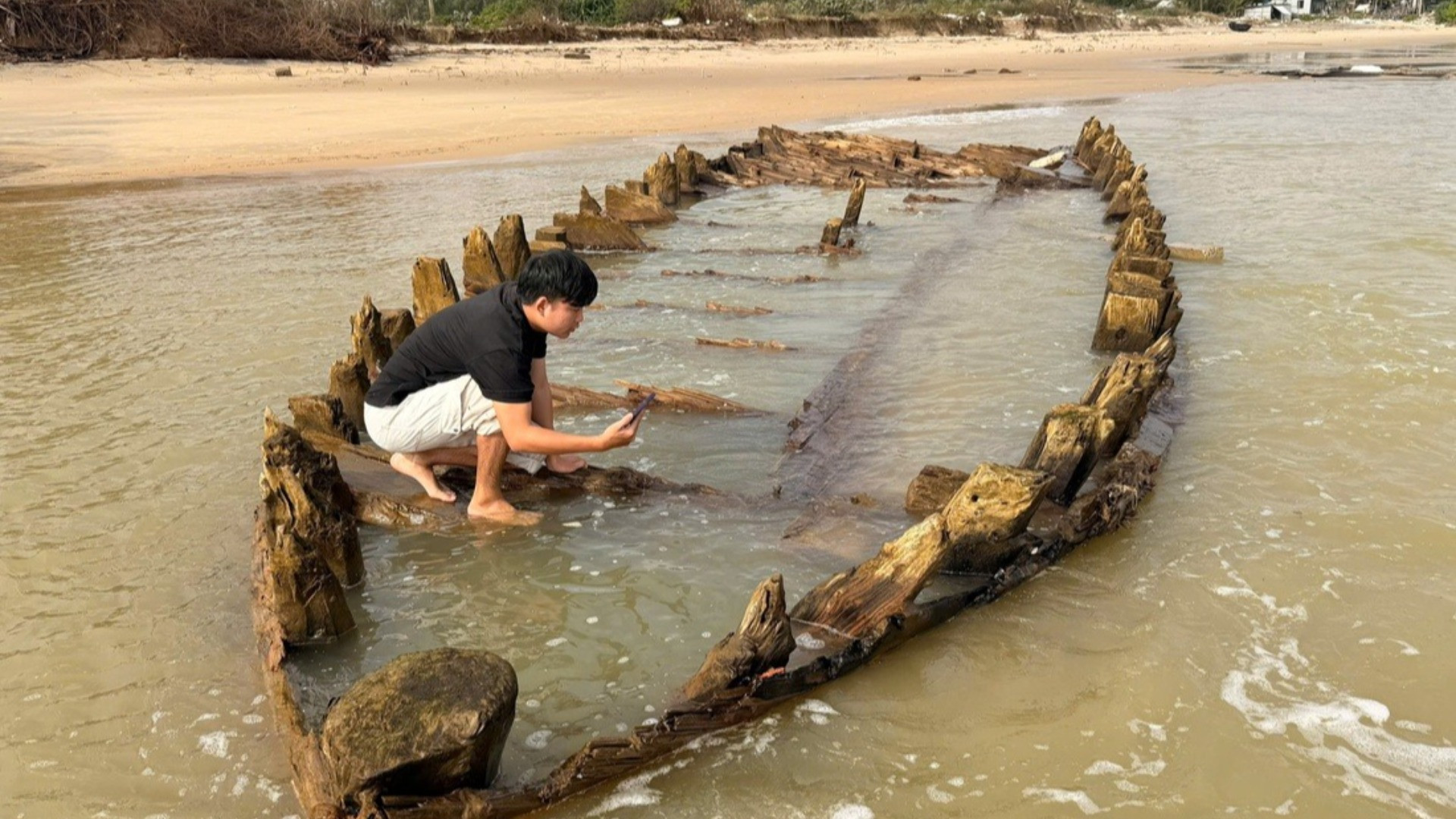 Un'antica nave di legno lunga almeno 17,4 metri è riemersa dalle sabbie sulla linea di costa della città storica di Hoi An, nel Vietnam centrale, dopo che le forti mareggiate provocate dal tifone Fengshen hanno eroso la spiaggia.