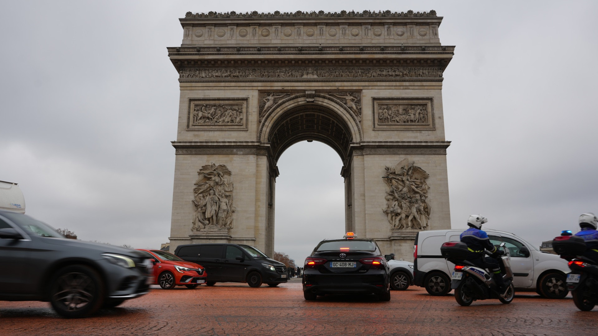 Attivisti di Greenpace cospargono di vernice arancione la piazza dell'Arc de Triomphe