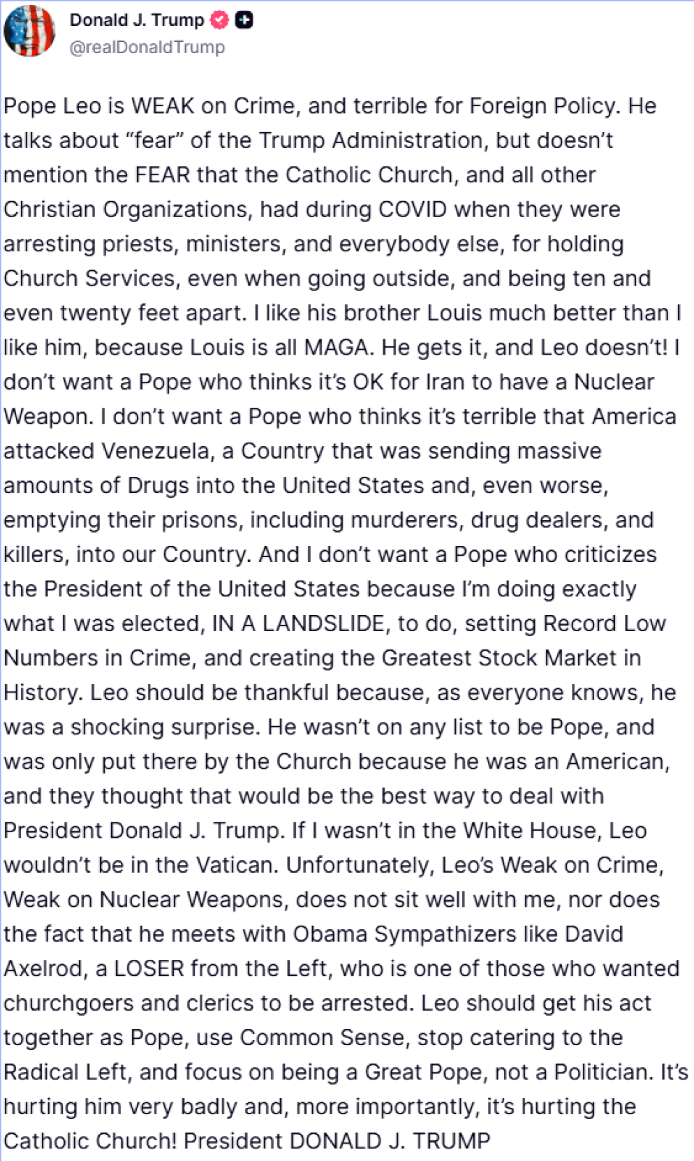 Un «papa di sinistra» danneggia la Chiesa, sostiene Trump, che dispensa consigli: «Leone dovrebbe darsi una regolata nel suo ruolo di papa, usare il buon senso, smettere di assecondare la sinistra radicale e concentrarsi sull'essere un grande papa, anziché un politico. Questo comportamento gli sta arrecando un danno gravissimo e, cosa ancora più importante, sta danneggiando la Chiesa cattolica!».