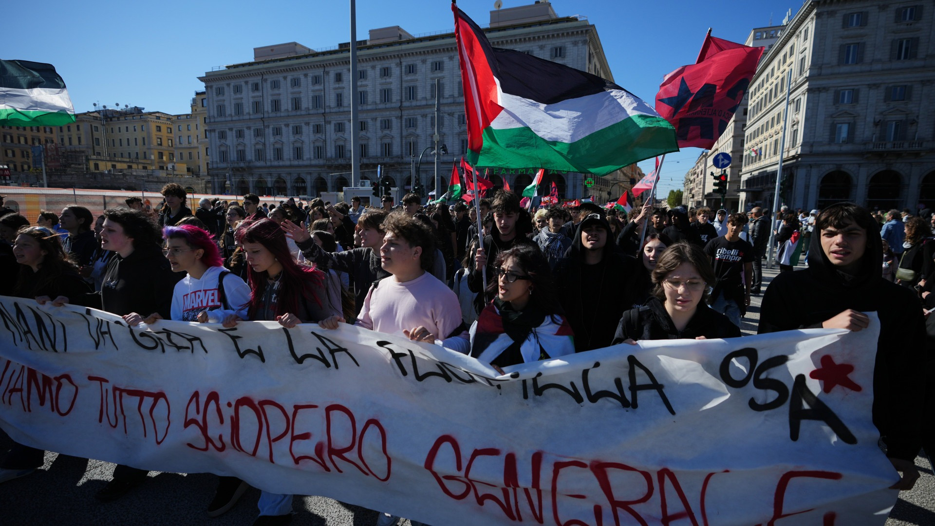 A Roma, si legge sull'ANSA, la giornata si è aperta con centinaia di persone radunate a piazza Vittorio, guidate dai vertici Cgil e dalla portavoce italiana della Flotilla Maria Elena Delia. Accanto a sindacalisti e studenti, hanno sfilato esponenti del Pd, di Avs e rappresentanti della comunità palestinese. Slogan e striscioni hanno accompagnato il corteo fino a piazza dei Cinquecento, al canto di «Bella ciao». Treni cancellati e con ritardi fino a 80 minuti si segnalano alla stazione Termini, dove l'ingresso principale è blindato da un cordone delle forze dell'ordine, dopo che una parte dei manifestanti ha accennato un piccolo corteo verso l'entrata.
