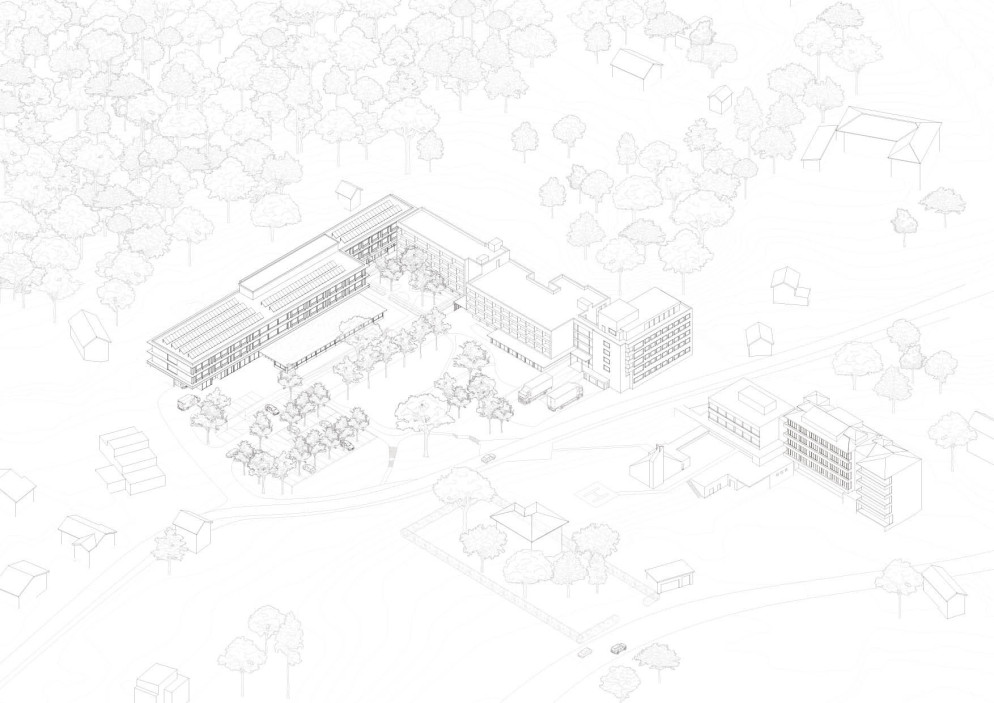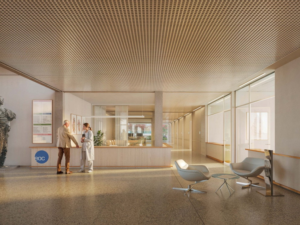 La rivalorizzazione del comparto completa il sistema esistente con «un gesto chiaro, definendo una corte aperta che ordina gli accessi, migliora la fruibilità e restituisce un parco accessibile e vissuto anche dagli abitanti della regione. L’insediamento si configura come un quartiere sociosanitario coerente e dinamico, capace di accogliere futuri sviluppi», si precisa. Chiarezza e funzionalità si ritrovano pure internamente: al pianoterra troveranno spazio Pronto soccorso, ambulatori, diagnostica e servizi amministrativi, mentre ai piani superiori si collocheranno «i reparti specialistici, la medicina acuta e i Reparti acuti a minor intensità (RAMI; n.d.r.), tutti facilmente accessibili e autonomi. Il piano interrato, oltre a ospitare parcheggi, zone tecniche e magazzini, è collegato alla casa per anziani e allo stabile dei servizi tramite corridoi riscaldati».