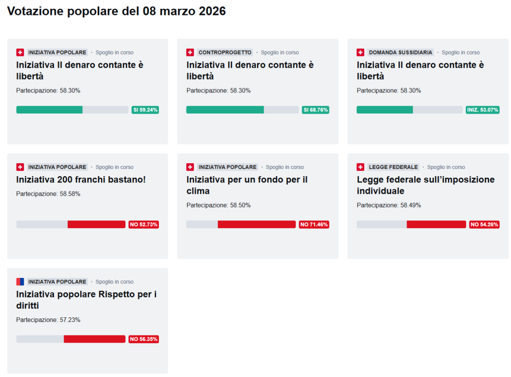 Ma in Ticino il «no» all'iniziativa SSR si ferma al 53,29% – «Sì» all'imposizione individuale, bocciato il fondo per il clima – Sul denaro contante passa il controprogetto – Ticinesi contrari all'iniziativa sul dumping salariale