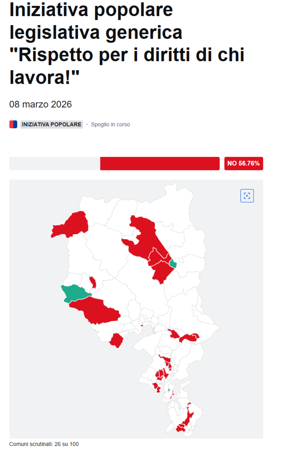 Su 26 Comuni scrutinati, sono al momento tre quelli in cui l'iniziativa «Rispetto per i diritti di chi lavora! Combattiamo il dumping salariale!» ha ricevuto una maggioranza di voti favorevoli: Campo Vallemaggia (20 «sì» su 30 votanti), Grancia (75 «sì» su 146 votanti) e Personico (137 «sì» su 278 votanti).