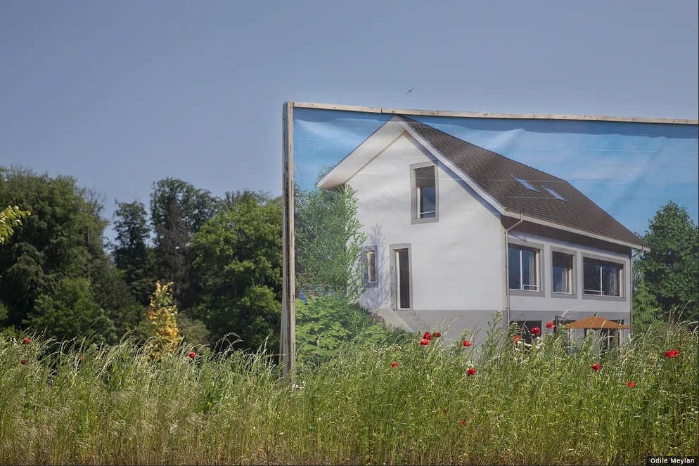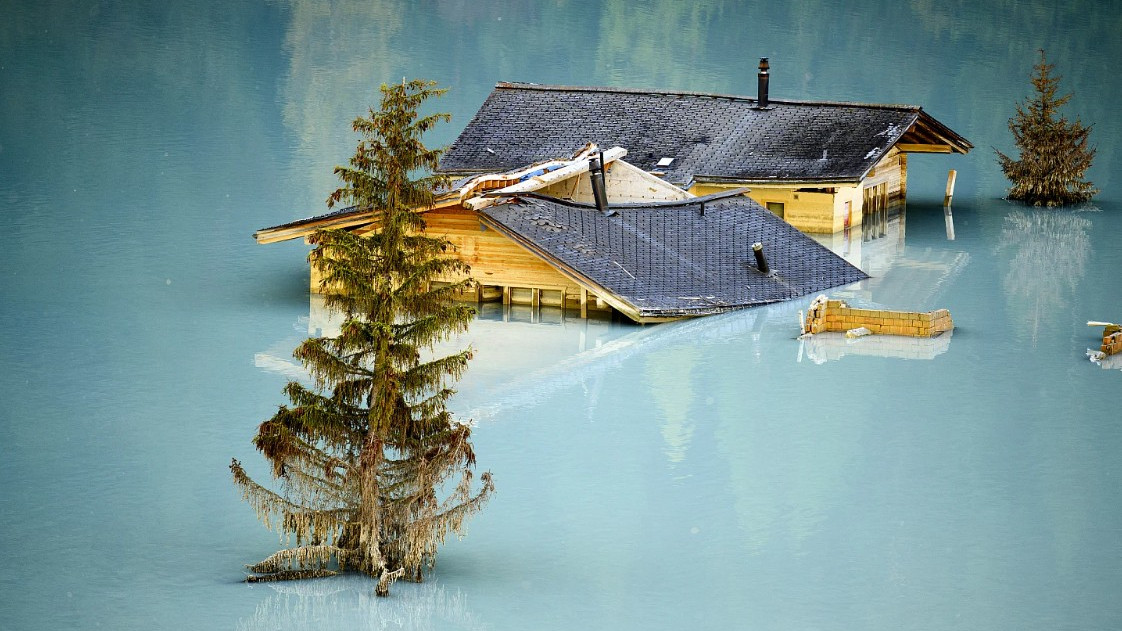 La fotografia di Gillieron mostra due case sommerse che emergono come isole dal lago formatosi in seguito alla devastante frana che ha colpito la zona.