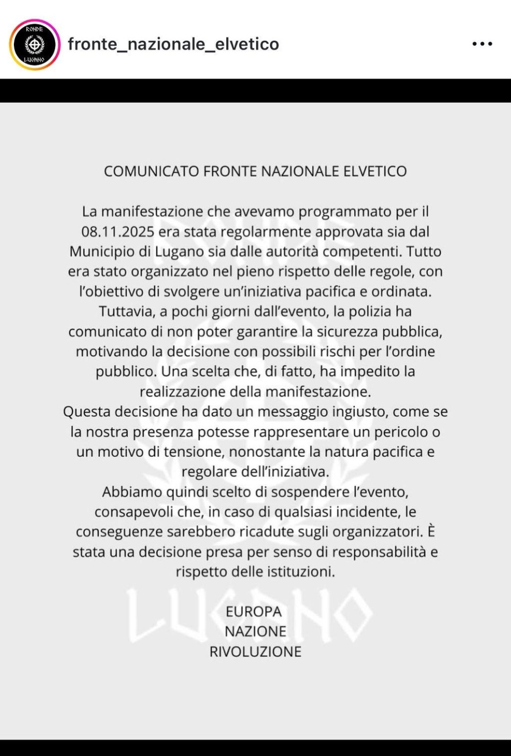 Proprio su Instagram, il «Fronte nazionale elvetico» ha spiegato che la decisione di sospendere l'evento è avvenuta in seguito alla comunicazione, da parte della polizia, dell'impossibilità di garantire la sicurezza pubblica. «In caso di qualsiasi incidente, le conseguenze sarebbero ricadute sugli organizzatori». Il gruppo, quindi, descrive la rinuncia come una decisione «presa per senso di responsabilità e rispetto delle istituzioni»