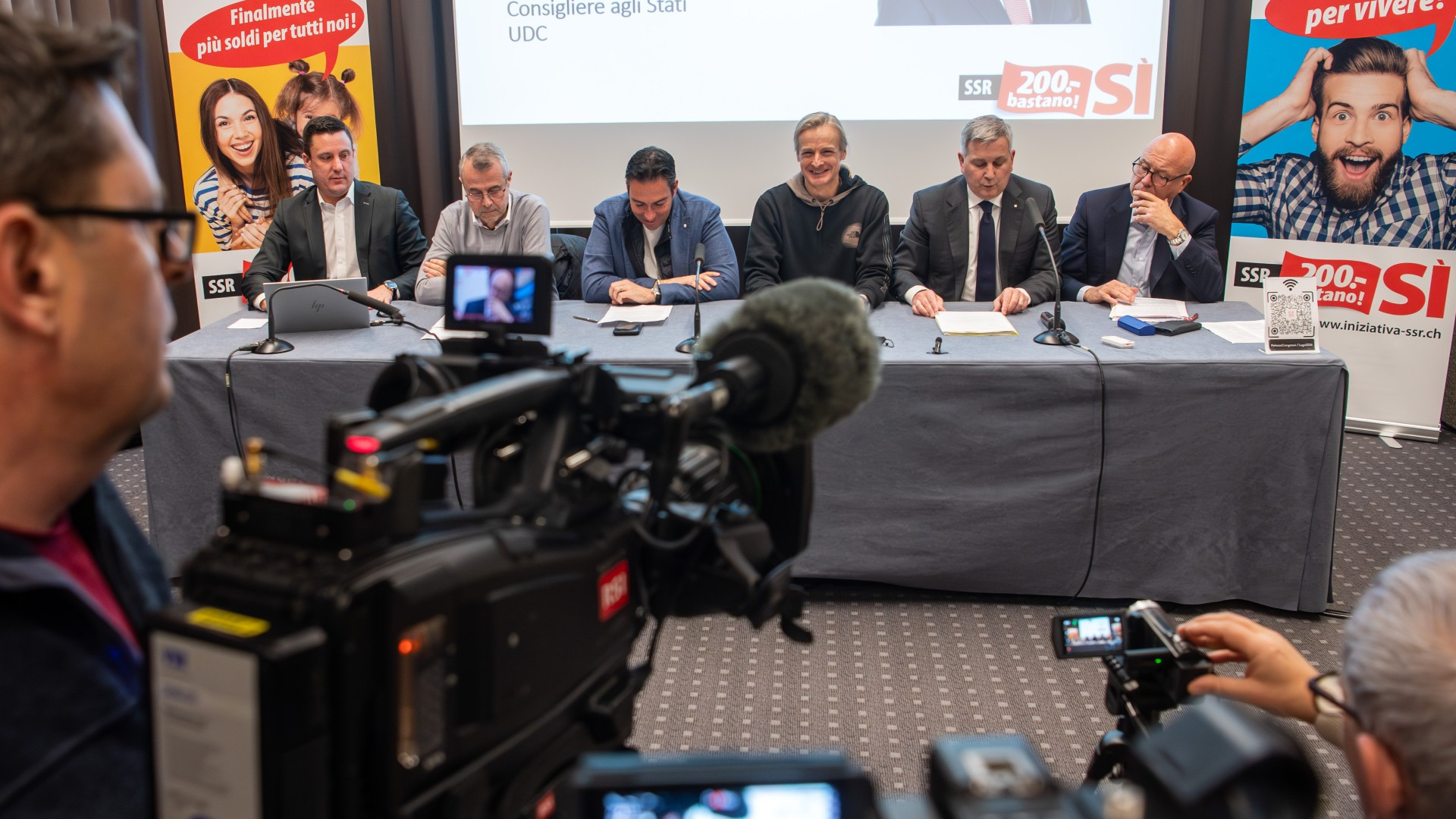 Il servizio pubblico deve tornare all'essenziale. È su questo principio che il comitato ticinese a sostengo dell'iniziativa popolare «200 franchi bastano!», in votazione l'8 marzo, ha insistito oggi in conferenza stampa al Palazzo dei Congressi di Lugano. Presenti i consiglieri agli Stati Marco Chiesa (UDC) e Fabio Regazzi (il Centro), i consiglieri nazionali Lorenzo Quadri (Lega dei Ticinesi) e Piero Marchesi (UDC), il vice-coordinatore della Lega dei Ticinesi Gianmaria Frapolli e l'ex consigliere comunale di Locarno Marco Bosshardt (PLR).