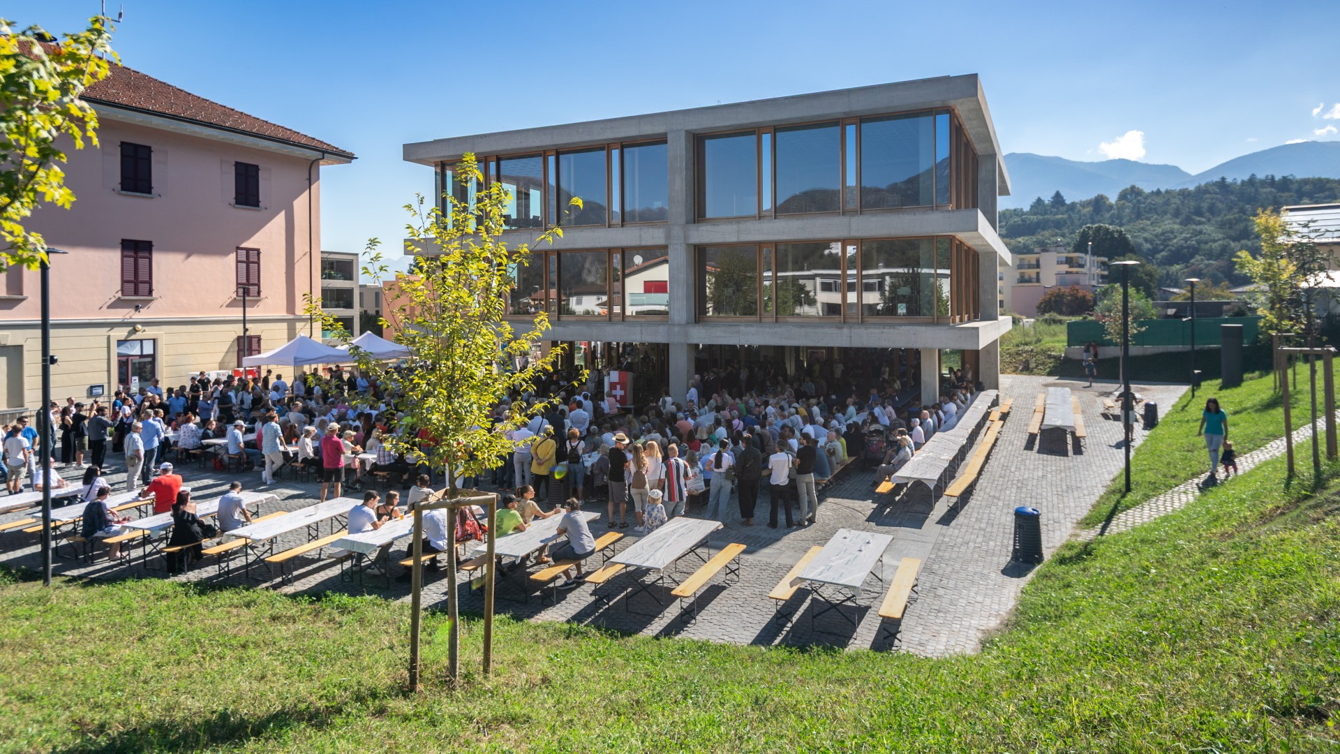 Cemento, legno e vetro. Tanto vetro. Malgrado le sue dimensioni imponenti, la nuova casa comunale di Losone è leggera e, soprattutto, trasparente. Una trasparenza che non emerge solo dall’architettura dell’edificio, progettato dallo studio Baserga Mozzetti, ma anche della volontà degli amministratori del Comune di svolgere sempre la loro attività alla luce del sole. «La fiducia la si conquista anche così», ha sottolineato il sindaco Ivan Catarin nel suo discorso pronunciato durante la cerimonia inaugurale andata in scena sabato. «Questa è prima di tutto casa vostra», ha aggiunto il sindaco rivolgendosi alle losonesi ed ai losonesi giunti numerosi alla cerimonia d’inaugurazione. Una cerimonia che segna la conclusione di un percorso che risale alla fine degli anni Ottanta del secolo scorso, quando aveva iniziato a prendere forma la volontà di dotare Losone di un nuovo centro. Poi, nel 2019, venne finalmente scelto il progetto e l’iter per la realizzazione della nuova sede dell’amministrazione comunale poté procedere celermente. Dalla posa della prima pietra sono passati poco più di due anni e sabato sono stati tolti ufficialmente i veli alla nuova casa comunale, che nel frattempo ospita già i vari servizi, compresi quelli della Polizia comunale. L’Ufficio tecnico è invece rimasto nella sua sede in salita Renecone.