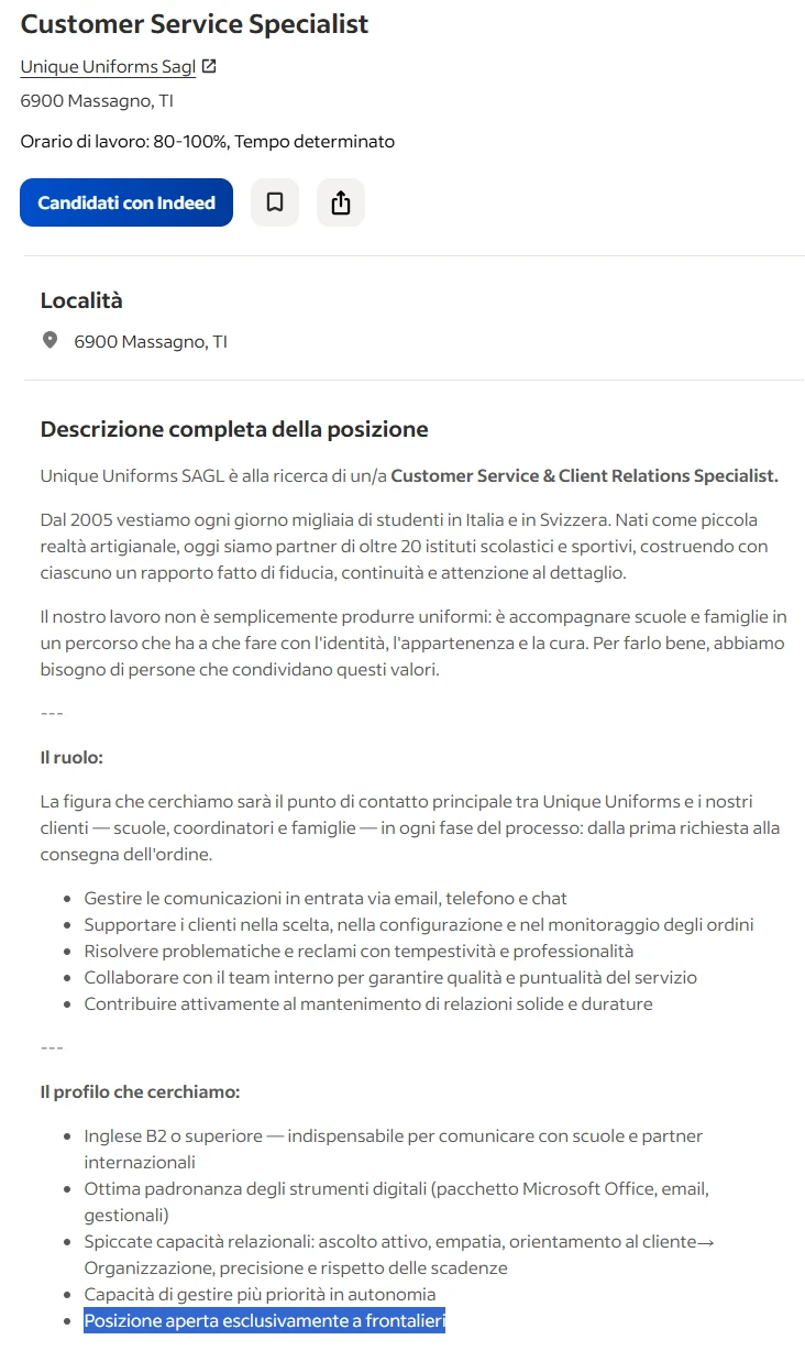 «Ennesimo annuncio di lavoro shock». A parlare è il granconsigliere (e co-presidente del PS) Fabrizio Sirica, il quale ha presentato una mozione – cofirmata da Maurizio Canetta – al Consiglio di Stato. L'annuncio: un’azienda di Massagno cerca un «Customer service specialist» a tempo determinato. Il profilo richiesto è di una persona formata: B2 o superiore in inglese, ottima padronanza degli strumenti digitali, capacità di gestire in autonomia il lavoro e soft skill caratteriali. «Ma lasciare esterrefatti è l’ultimo criterio: posizione aperta esclusivamente a frontalieri». Il perché è presto compreso, scrive Sirica: «Contratto all’80% per 34.800 franchi annui: 2.900 franchi al mese lordi per 12 mensilità».