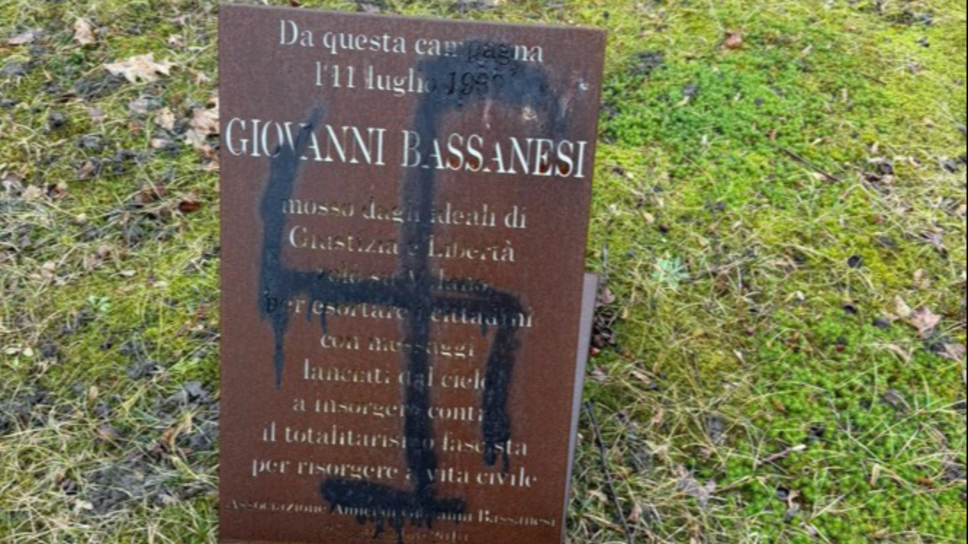 Una svastica e la scritta «Duce» sul monumento a Giovanni Bassanesi