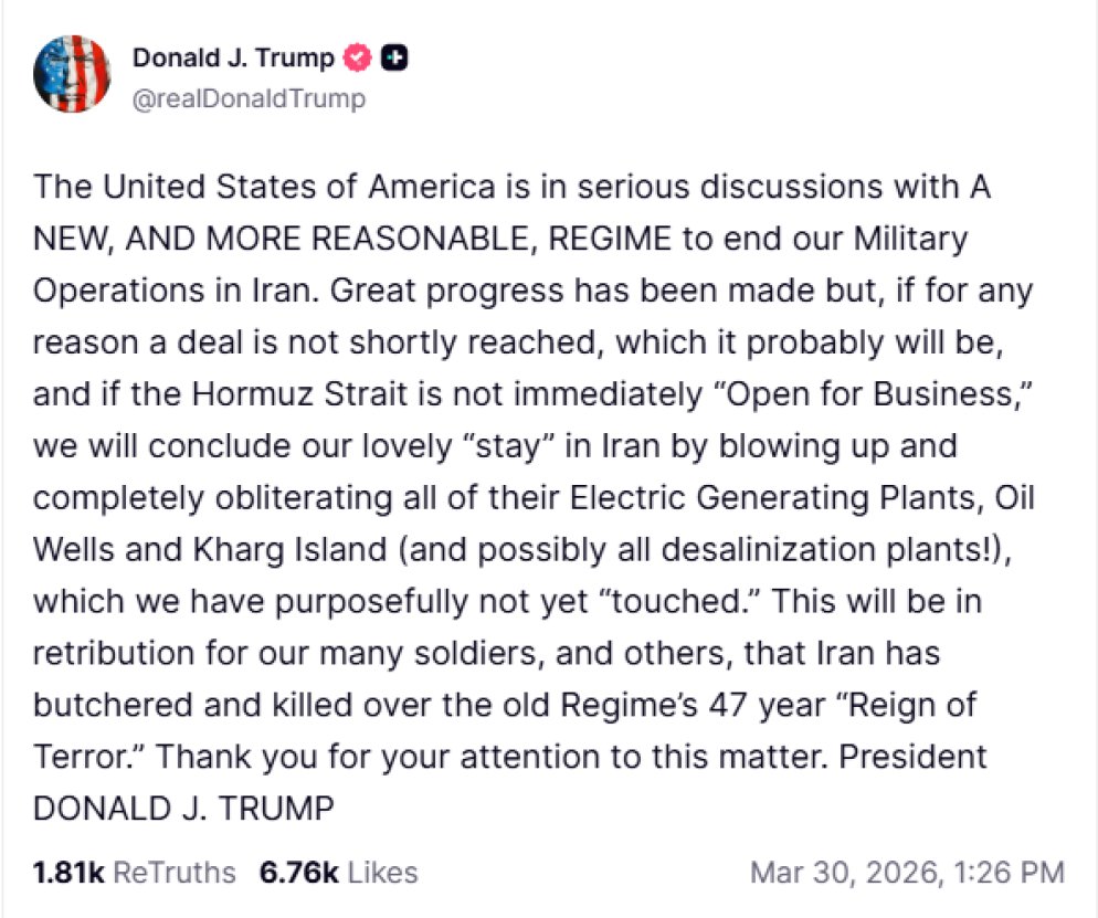 «Gli Stati Uniti sono in serie discussioni con il nuovo e più ragionevole regime» iraniano «per mettere fine alle operazioni militari. Grandi progressi sono stati fatti, ma se per qualsiasi ragione un accordo» non sarà raggiunto e lo «Stretto di Hormuz non sarà aperto immediatamente, concluderemo il nostro soggiorno in Iran distruggendo completamente i loro impianti elettrici, i pozzi petroliferi e l'isola di Kharg (probabilmente anche gli impianti di desalinizzazione)». Lo afferma Donald Trump sul suo social Truth.