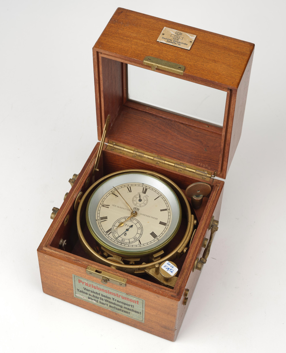 Proviene dalla «Svizzera sassone» questo cronometro da marina databile agli anni 60 del secolo scorso, quando quel lembo di territorio tedesco tradizionalmente votato alla micromeccanica di precisione (il toponimo Glashűtte riscalda il cuore di ogni appassionato di orologeria) faceva parte della Repubblica Democratica di Germania o Ddr. Firmato Gub – Glashűtter Uhrenbetriebe e custodito all’interno di una pregevole cassetta in mogano (soggetta alla normativa per la protezione delle specie), il segnatempo viene offerto da Dorotheum, il 24 marzo a Vienna (base 800 euro, dorotheum.com).
