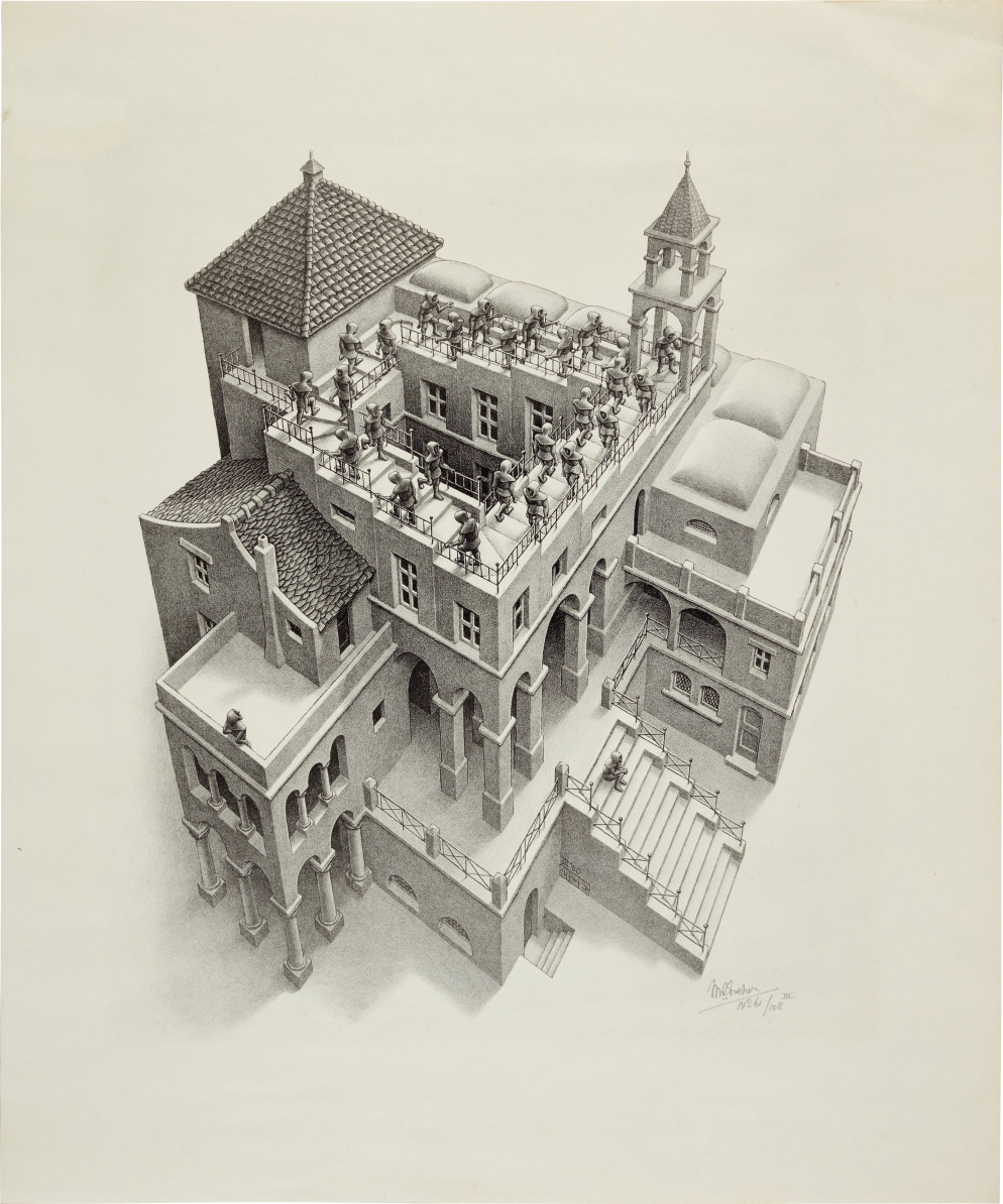 … c’è chi scende e c’è chi sale. È questo sicuramente il caso della scena che prende vita in Ascending and Descending, multiplo in cui Maurits Cornelis Escher (1898-1972) ricorre a tutta la sua abilità nel giocare con piani falsati e geometrie poco euclidee per generare l’impressione che i personaggi stilizzati (forse monaci) scendano e salgano sulla sommità di un edificio, intrappolati in una sorta di moto perpetuo. Un talento illusionistico, quello di Escher, che accomuna l’incisore e grafico olandese con artisti del passato come il fiammingo van Eyck o l’italiano Parmigianino, rendendolo particolarmente gradito non solo ai cultori delle belle arti, ma anche a logici, fisici e, in genere, agli indagatori delle scienze esatte e dei loro paradossi. Non a caso, questa litografia del 1960 è il risultato del dialogo tra Escher e il matematico britannico Roger Penrose, a sua volta impegnato in quei tempi nella rappresentazione di «oggetti impossibili». Firmata a matita e contrassegnata «III», impressa su carta vergata di 358x286 mm e tirata in 108 esemplari di cui quello sopra riportato è il numero 61, Ascending and Descending sarà oggetto del contendere nell’imminente asta di Stampe e Multipli di Sotheby’s Londra, in programma dal 18 al 25 marzo. La stima è compresa tra 31.448 e 52.413 franchi, in un incanto dove la parte del leone spetterà verosimilmente ai multipli di Andy Warhol – la sua Marilyn viene valutata tra 188.297 e 230.141 franchi –, oltre a quelli di Pablo Picasso, Henri Matisse, Andy Warhol, Roy Lichtenstein, David Hockney e Gerhard Richter, in una selezione di 130 lotti (tra cui non mancano ulteriori litografie e xilografie dello stesso Escher) che ripercorre le tappe fondamentali dell’arte contemporanea, dal postimpressionismo alla Pop Art (sotheby’s.com).