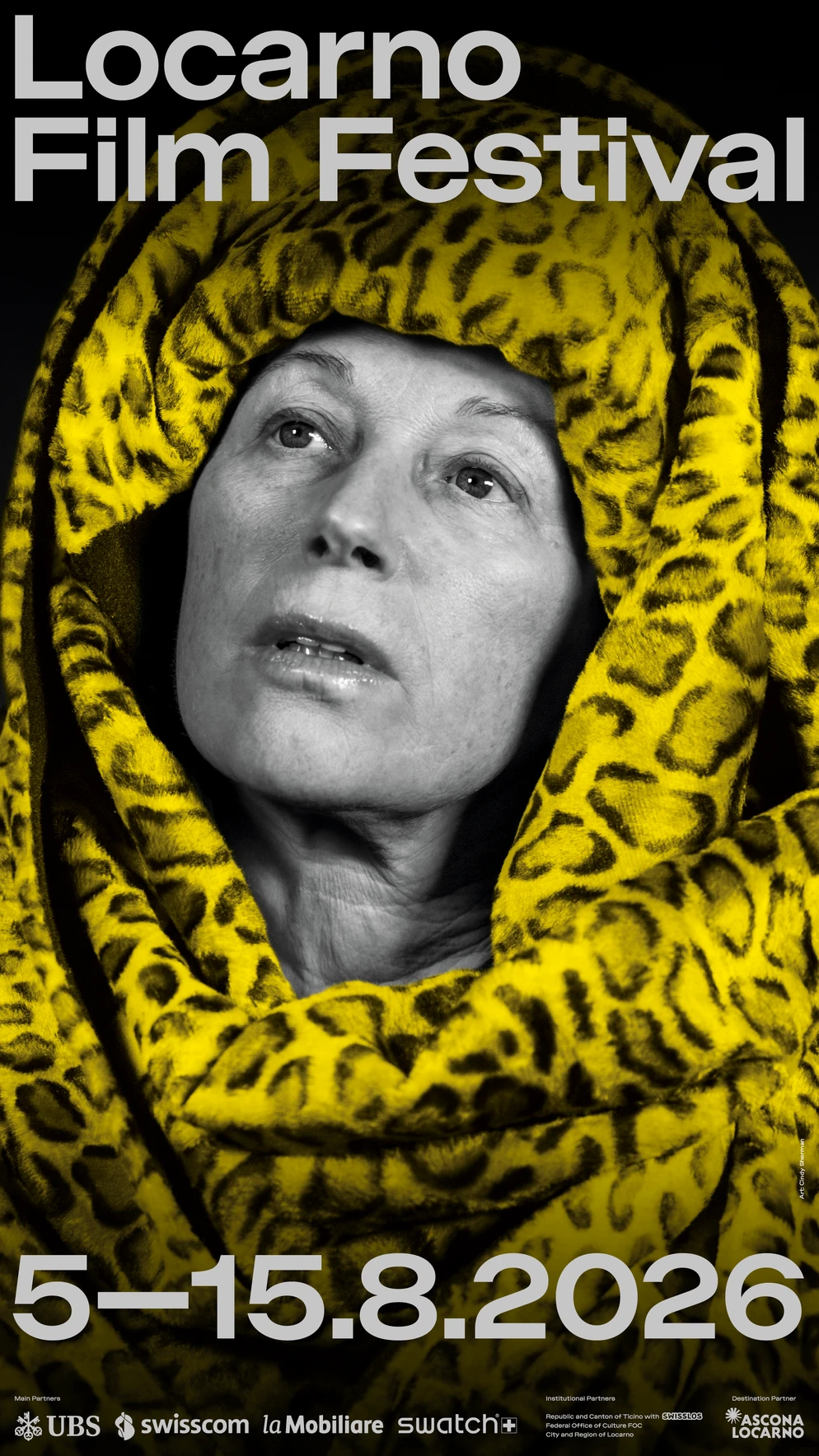 Per il poster ufficiale di Locarno79, Cindy Sherman ha reinterpretato il leopardo, simbolo del Festival, tramite la lente del suo inconfondibile linguaggio fondato su trasformazione e messinscena. Sherman rende così omaggio – «un grande onore», nelle parole dell’artista – all’immaginario storico della manifestazione: una figura di finzione, ritratta in bianco e nero, è avvolta da un drappo leopardato di un giallo vivido e brillante, evocando al tempo stesso un senso di eleganza e dissimulazione.