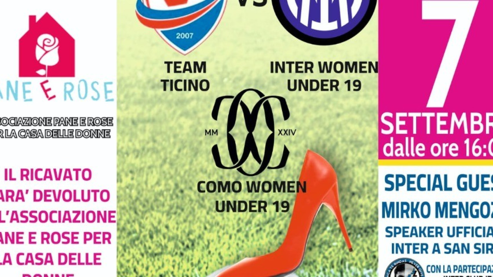 Il tutto inizia alle ore 16.00, con un triangolare di prestigio tra le squadre di calcio femminile del FC Inter U19, FC Como Women U19 e il Team Ticino Femminile U18; il tutto con la preziosa partecipazione di Mirko Mengozzi, speaker ufficiale dell’Inter allo stadio Meazza di Milano.
